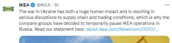 宜家的推文稱,俄烏沖突導(dǎo)致供應(yīng)鏈中斷、貿(mào)易受阻,因此決定暫時(shí)關(guān)閉其在俄羅斯的所有門店,并暫停在俄羅斯和白俄羅斯的所有采購計(jì)劃。此次的閉店活動(dòng),將對(duì)1.5萬的員工造成直接的影響,不過宜家表示,至少會(huì)在接下來的三個(gè)月為他們提供薪水,并為其家人提供支持。