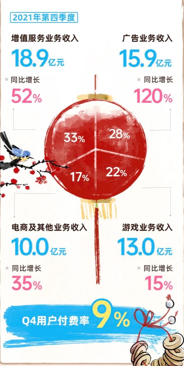 2021年四季度,在《碧藍(lán)航線》等獨(dú)代游戲穩(wěn)定的表現(xiàn)和全新發(fā)行游戲的貢獻(xiàn)下,B站游戲業(yè)務(wù)收入同比增長15%至13億元;依托直播及大會員業(yè)務(wù)的良好發(fā)展勢頭,增值服務(wù)業(yè)務(wù)收入達(dá)18.9億元,同比高速增長52%;在用戶快速增長與品牌影響力擴(kuò)大的強(qiáng)勁勢頭下,期內(nèi)廣告收入達(dá)15.9億元,同比大增120%;電商及其他業(yè)務(wù)同比增長35%,收入達(dá)10億元。