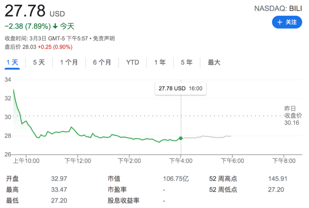 即便業(yè)績吊打一眾互聯(lián)網(wǎng)企業(yè),公司也信誓旦旦給出了盈利時(shí)間表,但二級市場投資者們似乎并未被陳睿打動(dòng),他們選擇了直接用腳投票——3月3日,B站美股表現(xiàn)不盡如人意,日內(nèi)跌幅達(dá)7.89%,報(bào)27.78美元/股。