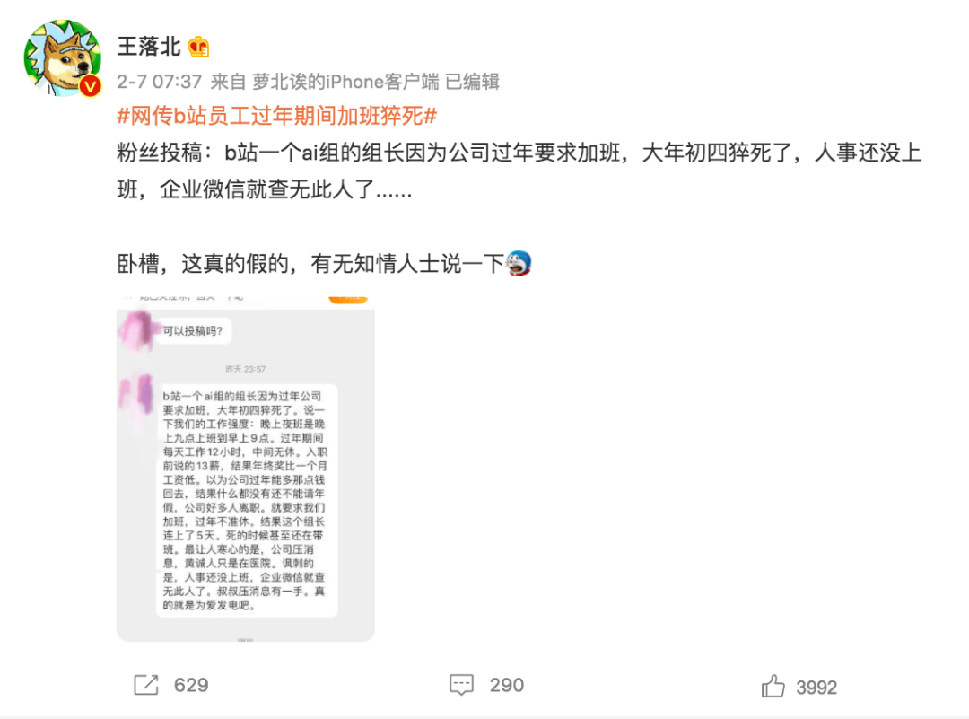 春節(jié)假期最后一天(2月6日),微博認(rèn)證用戶“王落北”稱收到來自B站員工爆料,稱B站武漢一位AI審核組組長過年期間因公司要求加班,于大年初四猝死,“人事還沒上班,企業(yè)微信就查無此人”。