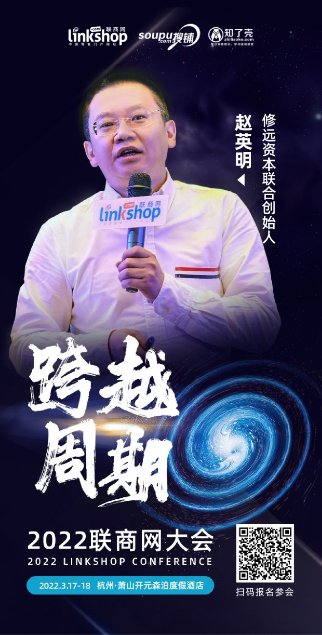2022年3月17-18日,由聯(lián)商網(wǎng)、搜鋪網(wǎng)、知了殼主辦的2022聯(lián)商網(wǎng)大會將在杭州召開,我們一起探討跨越周期,一起探究前行和揚升的未來道路。修遠(yuǎn)資本聯(lián)合創(chuàng)始人趙英明已確認(rèn)出席,這也是他離開京東后,首次以投資者身份在聯(lián)商網(wǎng)大會上分享,敬請期待!