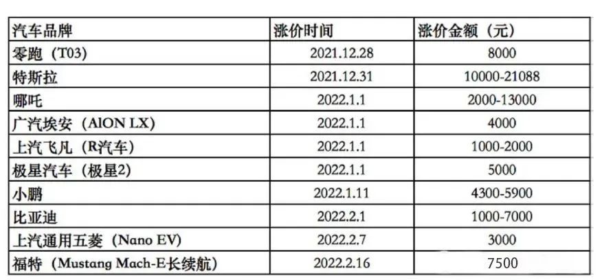 據(jù)“證券時報”統(tǒng)計,截至2月26日漲價的新能源車企