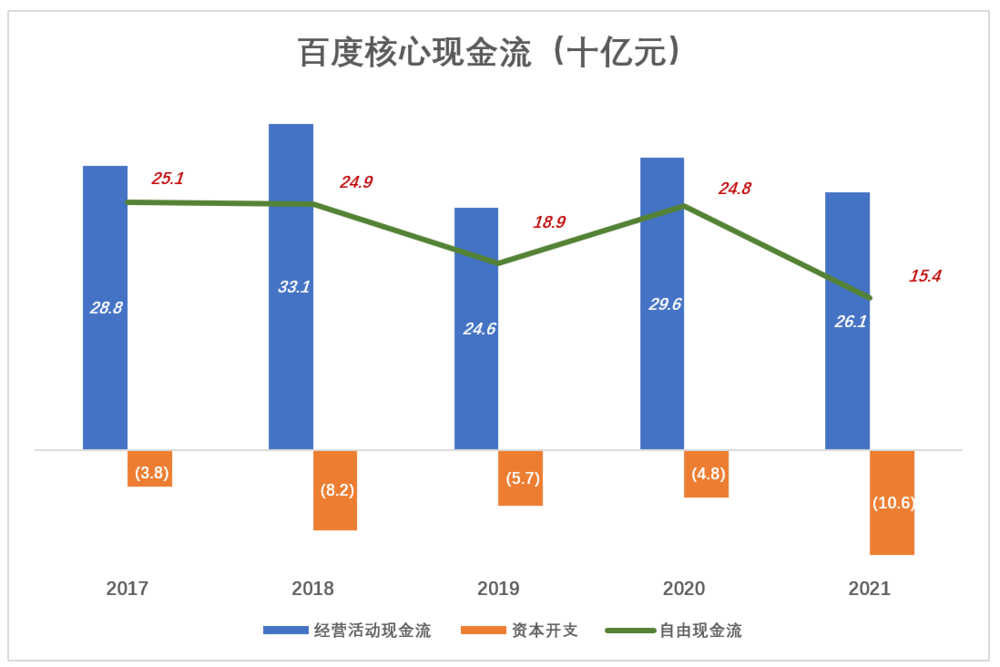 2021年百度核心資本開(kāi)支同比增長(zhǎng)120%,而自由現(xiàn)金流仍達(dá)100億,說(shuō)明百度相當(dāng)穩(wěn)健。