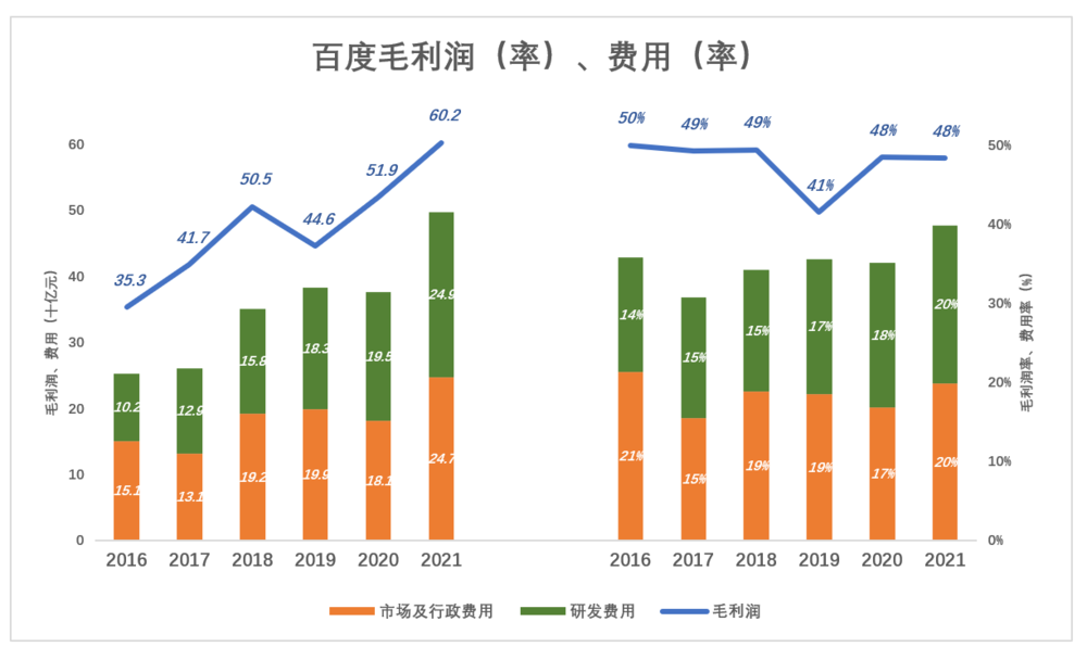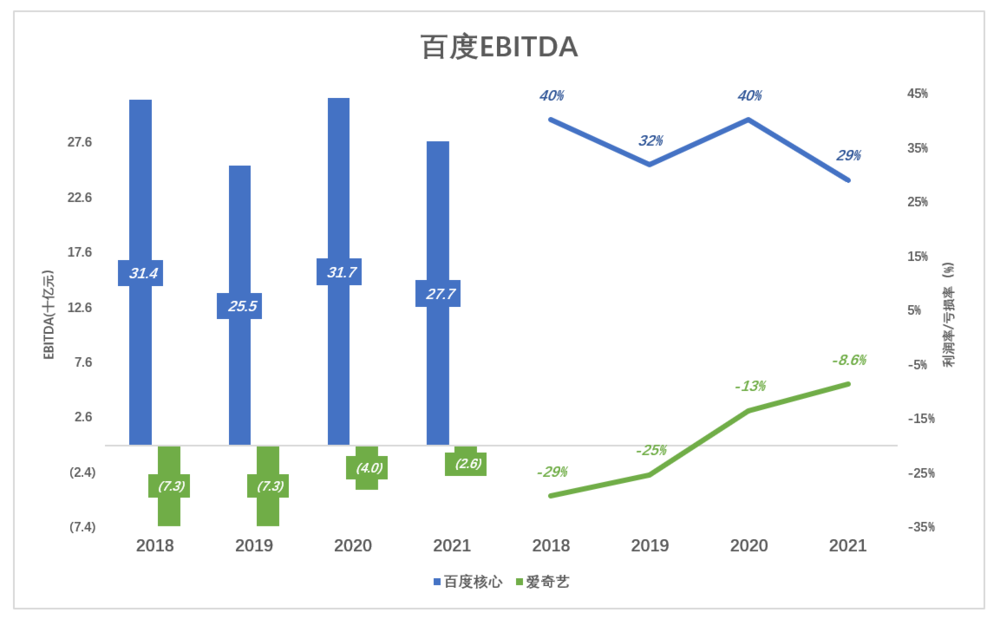 2018年,百度核心EBITDA達(dá)314億、利潤(rùn)率40%;2019年EBITDA降至255億、2020年又升高到317億、利潤(rùn)率再次占上40%;2021年EBITDA及利潤(rùn)分別回落到277億、29%。