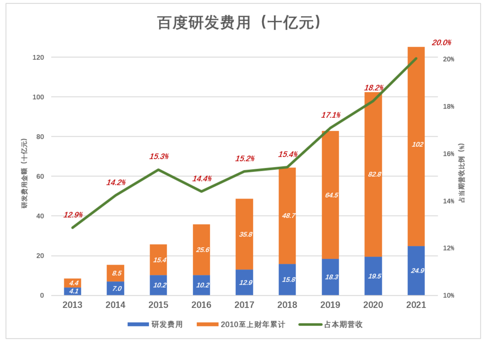 自2010年起,百度累計(jì)投入研發(fā)費(fèi)用1273億(接近200億美元)。