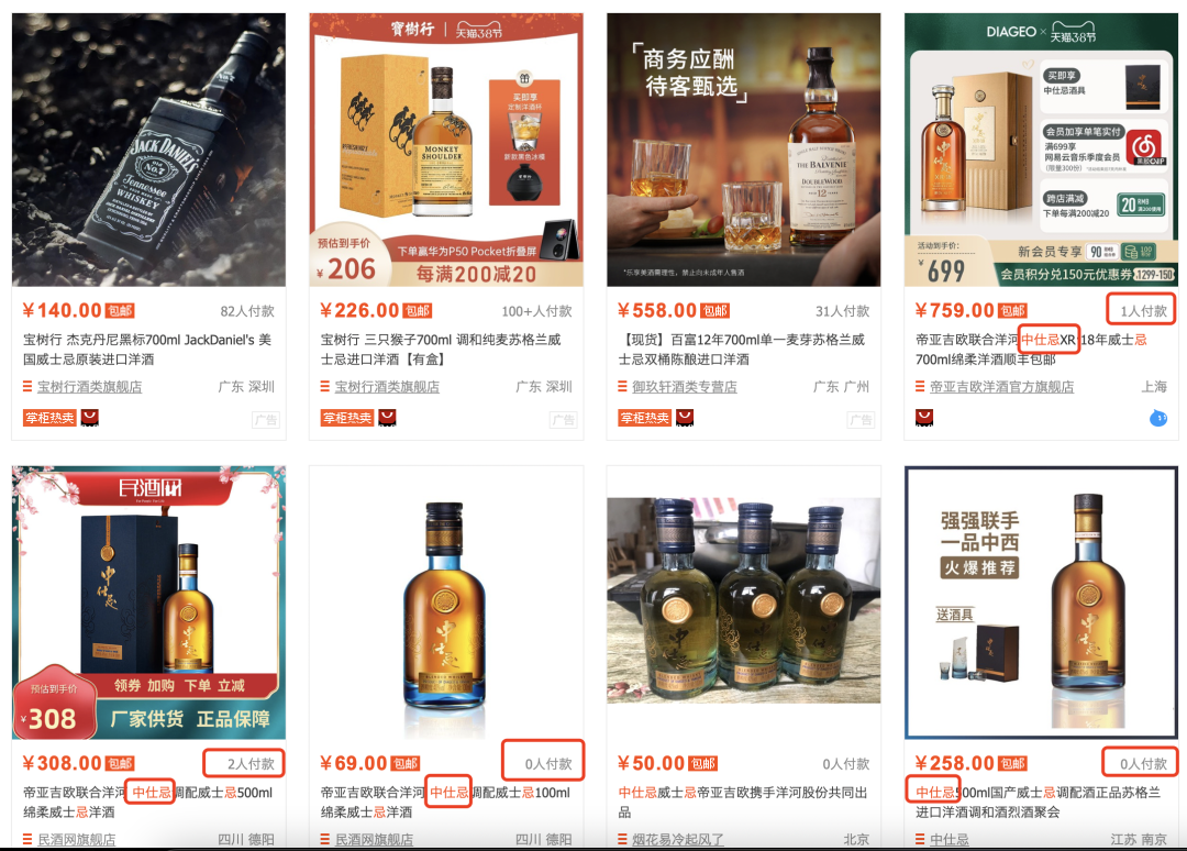 以洋河股份和帝亞吉?dú)W兩大巨頭高調(diào)合作推出的“中士忌”為例。有媒體在此后不久查詢(xún)帝亞吉?dú)W天貓旗艦店、中仕忌酒業(yè)淘寶店發(fā)現(xiàn),中仕忌700ML威士忌月銷(xiāo)量為0,帝亞吉?dú)W聚劃算平臺(tái)中仕忌500ML的月銷(xiāo)量在“狂歡價(jià)”刺激下也只賣(mài)出5瓶,這種所謂的“市場(chǎng)期待”確實(shí)讓人大跌眼鏡。時(shí)隔兩年后,筆者再次檢索帝亞吉?dú)W天貓官方旗艦店,中仕忌的頁(yè)面下是尷尬的“月銷(xiāo)1”。
