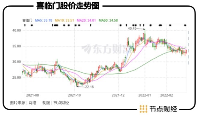 拉長(zhǎng)K線,自2021年初約18元/股到2022年初最高40.45元/股,喜臨門一年股價(jià)漲幅近125%,遙遙領(lǐng)先于行業(yè)其他選手,并成功完成2012年上市以來首個(gè)戴維斯雙擊。