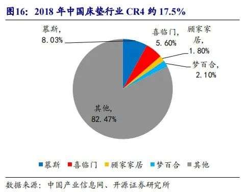 根據(jù)中國(guó)產(chǎn)業(yè)信息網(wǎng),2018年,中國(guó)床墊行業(yè)慕思、喜臨門、夢(mèng)百合的市場(chǎng)份額分別為8.03%、5.6%、2.1%,CR4只有17.5%。
