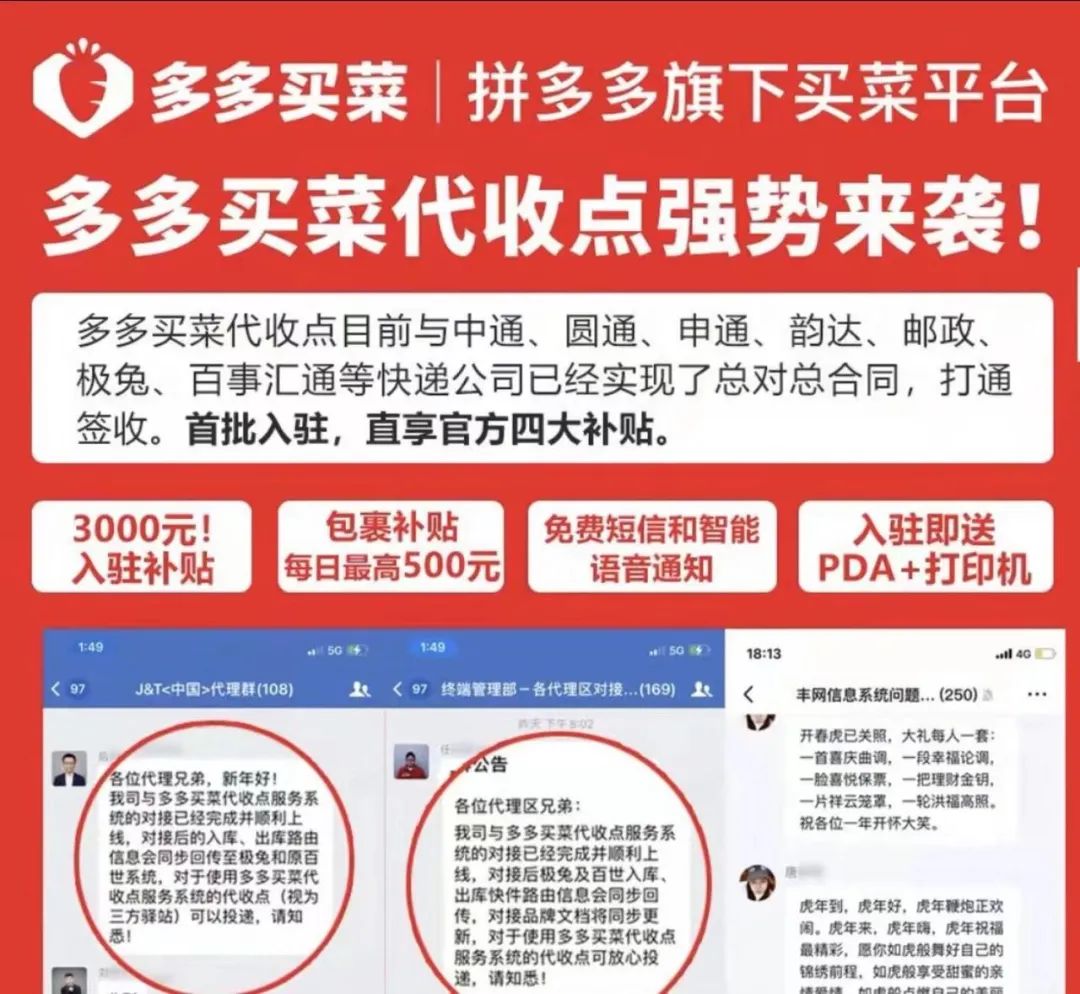 流傳在某快遞網(wǎng)點社群中的一份宣傳資料顯示,“多多買菜代收點目前已與中通、圓通、申通、韻達(dá)、郵政、極兔、百世匯通等快遞公司簽署合作協(xié)議,打通簽收系統(tǒng)”。