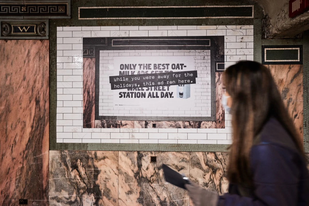 2021年圣誕節(jié)前一周,OATLY包下了華爾街地鐵站幾乎全部的廣告版面。