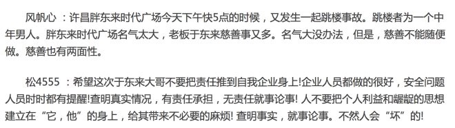 2014年,許昌胖東來時(shí)代廣場(chǎng),一名中年男子從商場(chǎng)四樓縱身跳下,自殺身亡…要知道——“這本是自殺,與胖東來并沒有直接因果關(guān)系”,但據(jù)說胖東來不僅出于人道主義賠了,而且賠了3位數(shù),只是“單位是萬元”…業(yè)內(nèi)還傳說一種說法——據(jù)傳,為此于東來先生還想成立“跳樓專項(xiàng)基金”,為在胖東來不幸跳樓的消費(fèi)者進(jìn)行人道主義補(bǔ)助,結(jié)果因?yàn)閾?dān)心產(chǎn)生負(fù)面引導(dǎo),最后只好作罷…聽起來很天方夜譚吧,但如若主角是“胖東來與于東來”,我們還真相信。比如此事件發(fā)生后的相關(guān)網(wǎng)友評(píng)論,放在當(dāng)下,敢相信嗎?