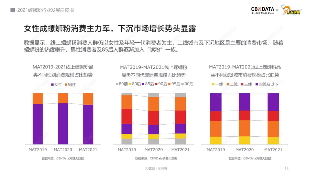 第一財(cái)經(jīng)商業(yè)數(shù)據(jù)中心發(fā)布的《2021螺螄粉行業(yè)發(fā)展白皮書》提到,線上螺螄粉消費(fèi)人群以女性及年輕一代消費(fèi)者為主,二線城市及下沉地區(qū)是主要消費(fèi)市場。在女性消費(fèi)者影響下,男性消費(fèi)者及85后人群也逐漸加入“嗦粉”一族。由此,廣西柳州的螺螄粉產(chǎn)業(yè)得到空前發(fā)展。
