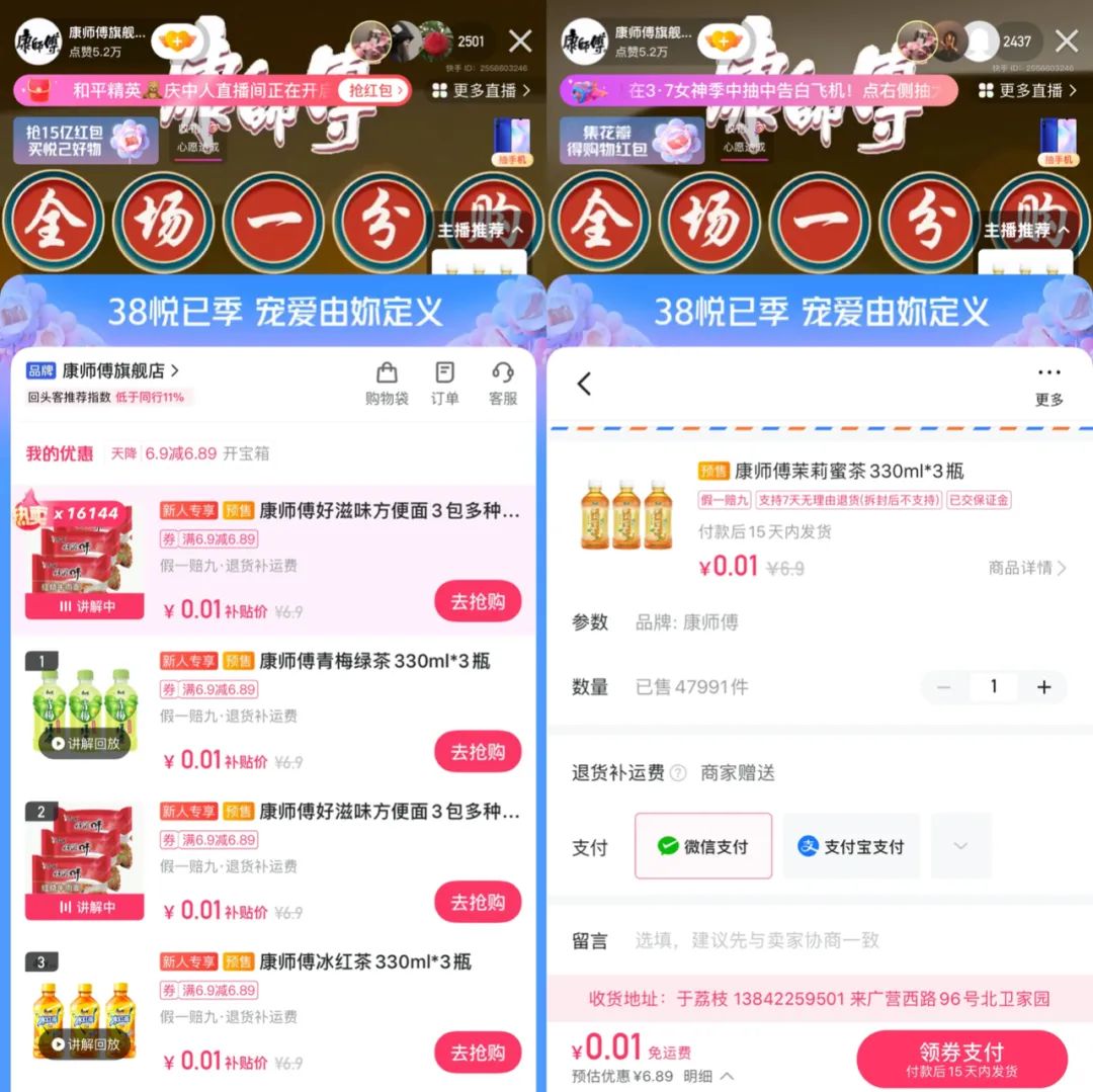 目前,康師傅、良品鋪子、百事可樂、徐福記等品牌的快手官方直播間均有一分購活動!感蚂亍褂^察發(fā)現(xiàn),僅有新用戶和30天之內(nèi)未在平臺下單的用戶,具有一分購資格。一分錢下單后,產(chǎn)品多會變成6.9元及以上價格。