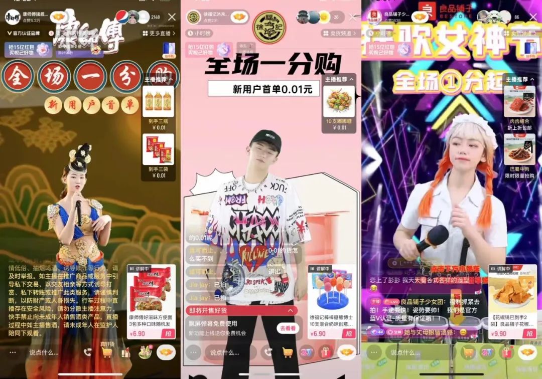 打開快手,會發(fā)現(xiàn)不少帶貨主播幾乎從不在直播間介紹產(chǎn)品,主播們幾乎不怎么說話,情緒也很平靜,只是不停地跟隨音樂搖晃著,身后背景板寫五個大字:“全場一分錢”,然后你會好奇點開小黃車,牙膏、牙刷、火雞面、心相印衛(wèi)生紙統(tǒng)統(tǒng)0.1元還包郵到家。