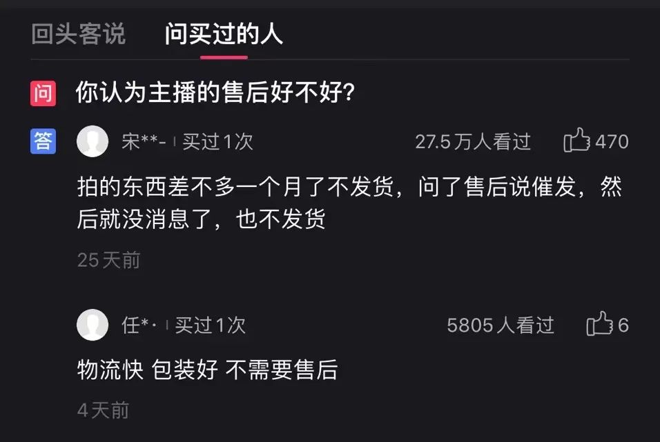 康師傅一分購直播間評分低的原因,在直播間問答區(qū)中可見一斑。在“你認為主播的售后好不好?”問題下,閱讀量和點贊量最高的回答為“拍的東西差不多一個月了不發(fā)貨,問了售后說催發(fā),然后就沒消息了,也不發(fā)貨!