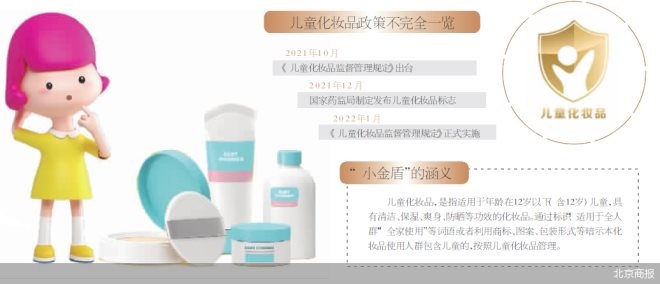 2022年1月,我國首個專門針對兒童化妝品的監(jiān)管法規(guī)文件《兒童化妝品監(jiān)督管理規(guī)定》落地實施,依據(jù)國家藥監(jiān)局關(guān)于發(fā)布《兒童化妝品監(jiān)督管理規(guī)定》的公告,自2022年5月1日起,申請注冊或進行備案的兒童化妝品,必須標注“小金盾”;此前申請注冊或進行備案的兒童化妝品,未按照規(guī)定進行標簽標識的,化妝品注冊人、備案人應(yīng)當在2023年5月1日前完成產(chǎn)品標簽更新。