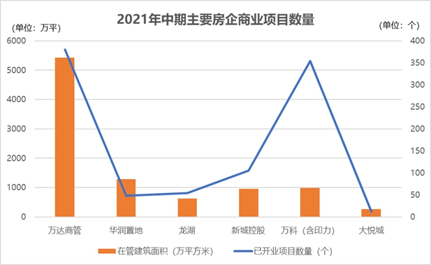 截至2021年中期,萬科商業(yè)項(xiàng)目數(shù)量達(dá)到354個(gè),有“小萬達(dá)”之稱的新城控股,已開業(yè)項(xiàng)目105個(gè),而華潤(rùn)置地、龍湖、大悅城的開業(yè)項(xiàng)目數(shù)量分別為48個(gè)、54個(gè)和15個(gè)。