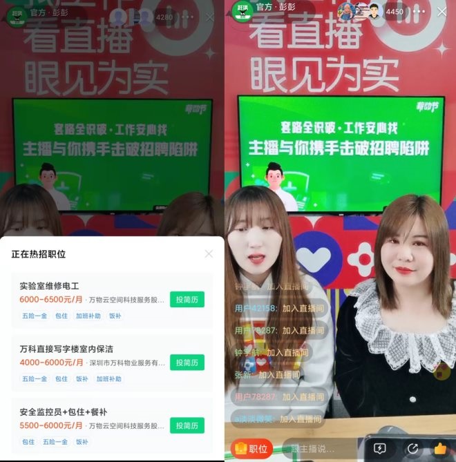 趕集直招的每個(gè)官方直播間,背景都有“看直播,找工作,眼見(jiàn)為實(shí)”的字樣。