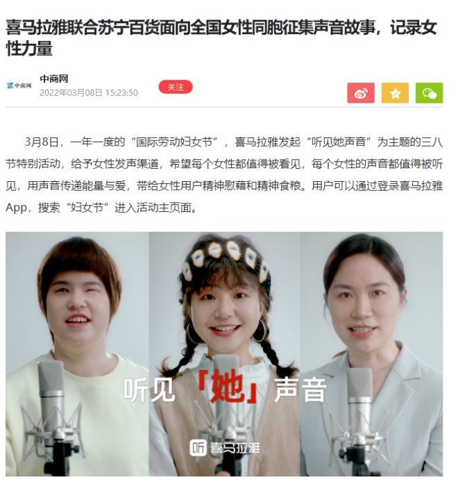 在3.8前夕,蘇寧百貨聯(lián)合喜馬拉雅APP,開展“聽她們說”線上社交活動,一同傳達(dá)女性力量中的堅韌與永不言棄。本次“聽她們說”活動,也得到了中新社、財經(jīng)網(wǎng)、中商網(wǎng)、中國經(jīng)營網(wǎng)、鳳凰網(wǎng)、金融界、中國網(wǎng)商務(wù)等多家媒體報道,獲得了一致好評。
