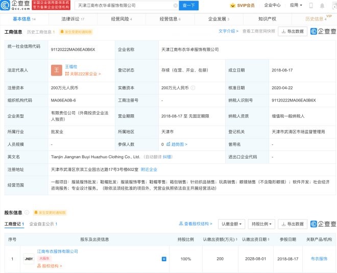 根據(jù)企查查信息,天津江南布衣華卓服飾有限公司公司成立于2018年,法定代表人為王福柱,注冊資本200萬元人民幣,由江南布衣服飾有限公司100%控股。