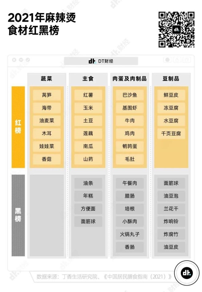 DT君根據(jù)丁香生活研究所發(fā)布的麻辣燙相關(guān)研究和《中國(guó)居民膳食指南》,整理出了一份麻辣燙食材紅黑榜,如果想要吃得健康,不妨參考一下這份榜單。