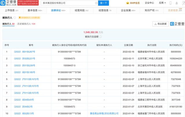 企查查風(fēng)險信息顯示,泰禾集團目前共有被執(zhí)行人信息22項、失信信息13項、限制高消費信息26項,其當前被執(zhí)行總金額為154.84億。