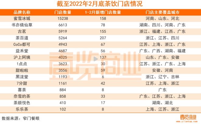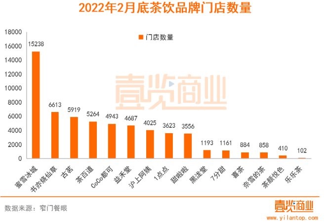 數(shù)據(jù)顯示,截至2月底,這15家茶飲品牌的門店數(shù)量合計(jì)達(dá)到58476家,其中有9個(gè)品牌門店數(shù)量都在3000以上。