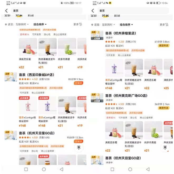 《壹覽商業(yè)》在點(diǎn)餐時(shí)發(fā)現(xiàn),中午時(shí)分喜茶的大部分門店都處于休息狀態(tài),而在晚上又重新開業(yè)。有知情人士告訴壹覽商業(yè)稱,這是爆單導(dǎo)致的,并表示近期很多城市都出現(xiàn)了這種情況。