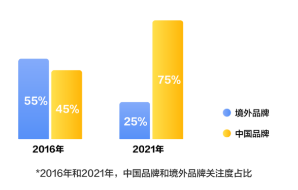一方面,國貨品牌的關(guān)注度不斷上升,已是不爭的事實。根據(jù)百度發(fā)布的《百度2021國潮驕傲搜索大數(shù)據(jù)》,近5年國貨品牌搜索熱度占品牌總熱度的比例從45%提升到了75%,是同期國外品牌搜索熱度的3倍,近10年消費者對于國潮的關(guān)注度上升了5.28倍。