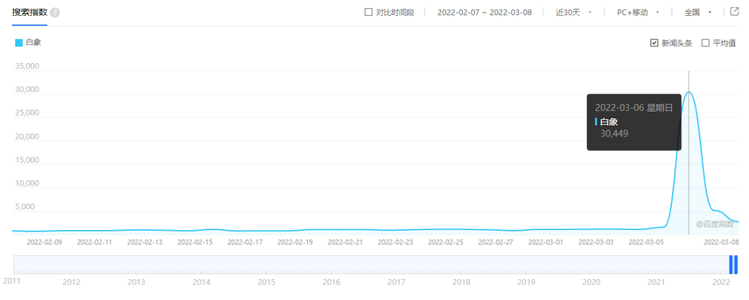 白象意外走紅后,其關(guān)注度也直線上升。據(jù)百度搜索指數(shù)和微信指數(shù)顯示,白象的相關(guān)數(shù)據(jù)都在3月6日達到了近一個月內(nèi)的峰值。