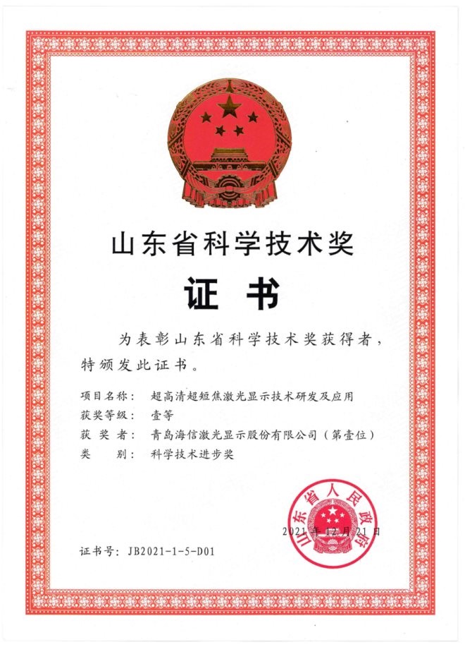 日前,山東省政府發(fā)布《關(guān)于2021年度山東省科學(xué)技術(shù)獎(jiǎng)勵(lì)的決定》。青島海信激光顯示股份有限公司“超高清超短焦激光顯示技術(shù)研發(fā)及應(yīng)用”項(xiàng)目榮獲山東省科技進(jìn)步獎(jiǎng)一等獎(jiǎng)。