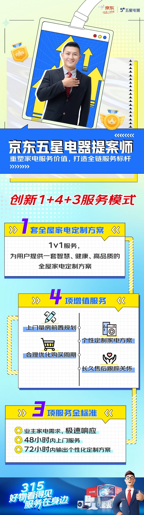 據(jù)京東五星電器介紹,提案師定義為“家”生活場景解決方案提案者,把握好顧客的需求,提出最適合用戶的家居家電方案建議,并向顧客傳達(dá)當(dāng)下流行趨勢,幫助用戶盡善盡美的生活!1+4+3”服務(wù)模式則是指1套全屋家電定制方案、4項(xiàng)增值服務(wù)和3項(xiàng)服務(wù)金標(biāo)準(zhǔn)。