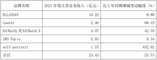 分品牌看,ELLASSAY品牌實現(xiàn)收入約10.22億元,同比增長8.88%;Laurèl品牌收入2.46億元同比增長68.19%;self-portrait品牌實現(xiàn)收入約1.75億元,同比增長432.62%;Ed Hardy品牌全年收入同增42.76%至3.07億元;IRO Paris品牌收入達到5.93億,增長9.34%。