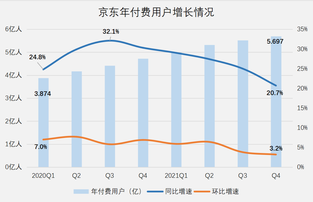 以剛剛公布去年報(bào)表的阿里為例,過去一年,淘特依靠“三直”在下沉市場(chǎng)站穩(wěn)腳跟,同時(shí)帶來了新的用戶群體,2021年全年凈增AAC為1.04億人。再看看第四季度,京東AAC相比2020年累計(jì)凈增0.9670億人,體量不及貓,還比貓跑得慢。