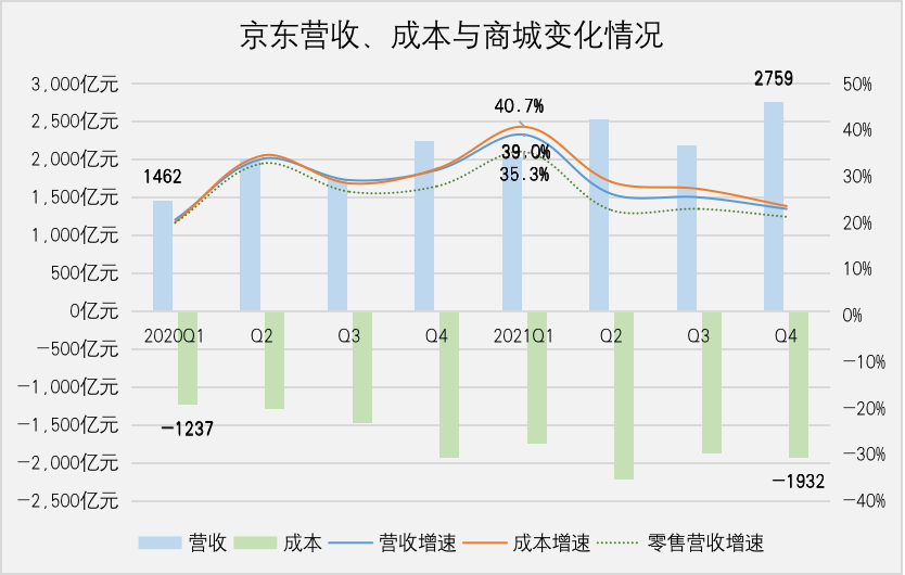 眾所周知,上半年的618也好,下半年的雙十一也罷,大促所帶來的高增長(zhǎng)已不復(fù)往日。截至Q4,京東單季度實(shí)現(xiàn)營收2759億元,同比增長(zhǎng)23%,并未看到增速有明顯放緩。