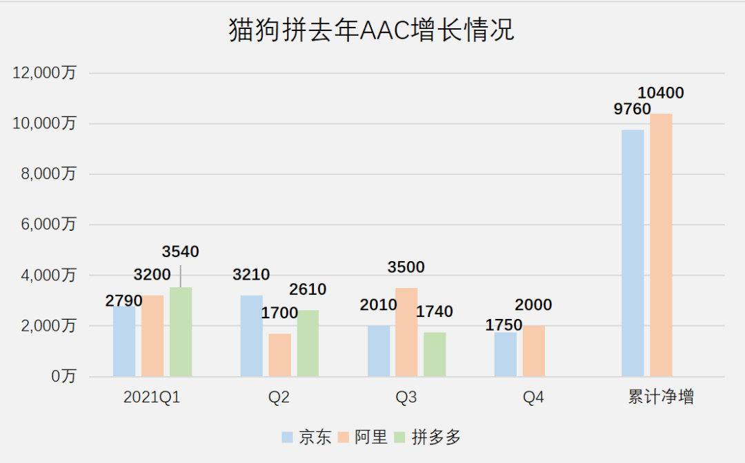 反映到季度凈增用戶數(shù)上更為明顯,今年四個(gè)季度中,京東凈增用戶數(shù)依次為2790萬、3210萬、2030萬、1750萬,對(duì)比AAC基數(shù)更大的貓拼,反而沒有任何增長(zhǎng)優(yōu)勢(shì)。