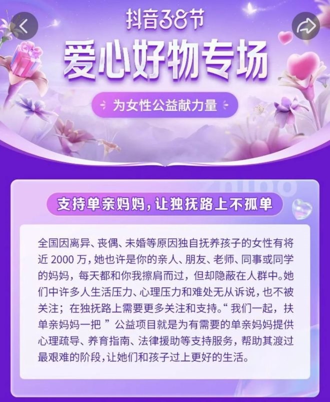 為幫助更多女性,抖音38節(jié)與深圳壹基金基金會的公益項(xiàng)目「我們一起,扶單親媽媽一把」進(jìn)行聯(lián)動,設(shè)置了“愛心好物”專場,并上線“愛心好物品牌”榜及“人氣愛心好物”榜。消費(fèi)者每購買一次帶有“愛心好物”標(biāo)識的商品,平臺商家便會向該公益項(xiàng)目進(jìn)行一定金額的捐贈,為獨(dú)撫母親提供支持和援助。