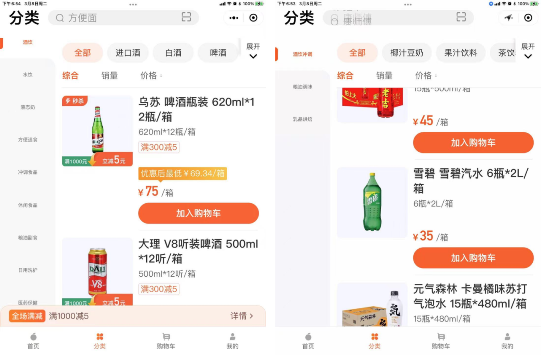 目前,平臺中SKU相對有限,僅有百余。其中,云南地區(qū)商品還只有酒飲沖調(diào)、乳品烘焙、休閑零食、糧油調(diào)味、個護清潔五個類目,每個類目涉及的品牌僅有一兩個。浙江地區(qū)業(yè)務(wù)更是僅有酒飲沖調(diào)、糧油調(diào)味、乳品烘焙三個類目,SKU尚未過百。