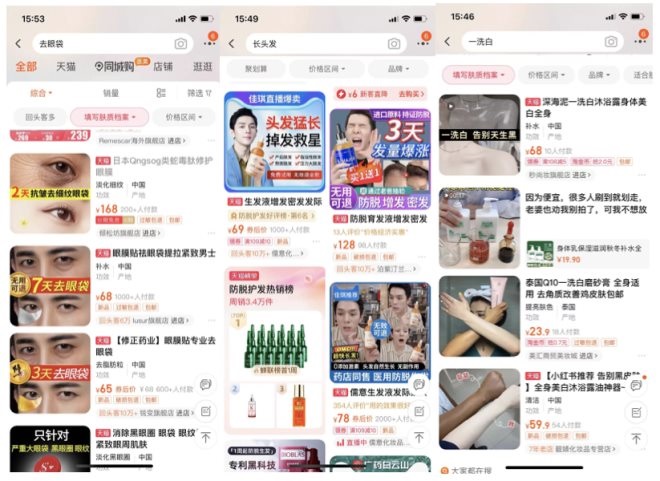 隨著我國化妝品行業(yè)法律法規(guī)的密集出臺,該行業(yè)也暴露出很多問題,虛假資料屢禁不止。從淘寶隨手一搜,一些駭人聽聞的宣傳就會浮出水面,什么一洗白、三天發(fā)量暴增、三天去眼袋之類的資料圖讓人啼笑皆非。類似產(chǎn)品怕不是科學(xué)研發(fā)出來的,而是“一鍵美顏”來的吧。