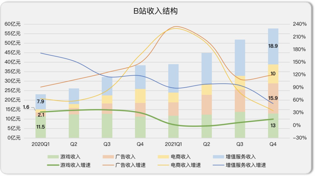從B站的收入結(jié)構(gòu)可以看到,游戲收入,確切地說(shuō)是來(lái)自游戲分發(fā)的收入,六個(gè)季度后被增值服務(wù)反超,增速上保持很強(qiáng)韌性。由于缺乏爆款,單純依靠年輕社區(qū)做游戲分發(fā)看上去不是一條穩(wěn)定的道路。