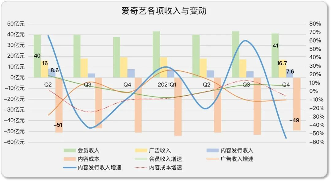 最近六個(gè)季度以來(lái),愛(ài)奇藝的會(huì)員收入因?yàn)樾略龈顿M(fèi)用戶(hù)增長(zhǎng)不佳、迫于壓力取消超前點(diǎn)映,導(dǎo)致數(shù)據(jù)表現(xiàn)并不好看。與此同時(shí),廣告收入長(zhǎng)期低迷不振,內(nèi)容發(fā)行收入始終難堪大任。一旦占據(jù)大頭的會(huì)員收入增速低于內(nèi)容成本增速,那么愛(ài)奇藝根本不可能在業(yè)績(jī)上有任何改觀。
