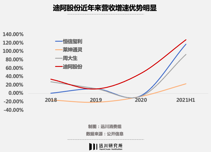 對比與DR競品關系直接的 I DO,在DR母公司迪阿股份營收大幅增長的年份,I DO 母公司恒信璽利的增長疲軟,甚至出現(xiàn)了負增長。以同期可比數(shù)據(jù)來看,截至2021年上半年,迪阿股份的營收是恒信璽利的2倍(23.2億元 VS 10.8億元),但迪阿股份的全國門店數(shù)量僅約后者的一半(375家 VS 717家)。