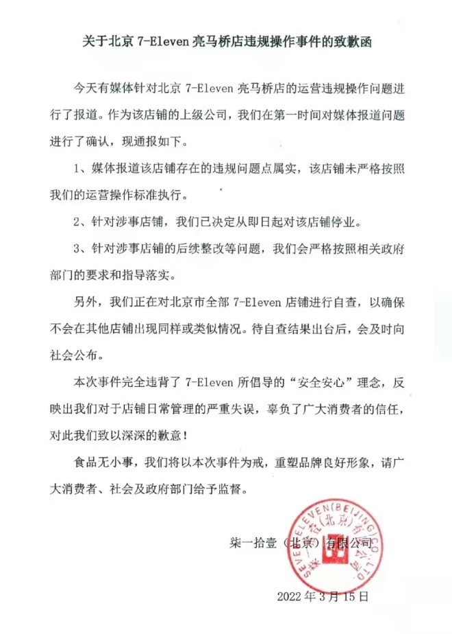 對(duì)此,3月15日晚間,北京7-ELEVEn便利店在其微信公眾號(hào)發(fā)布致歉函稱,媒體報(bào)道的店鋪存在的違規(guī)問(wèn)題點(diǎn)屬實(shí),針對(duì)涉事店鋪,已決定從即日起對(duì)店鋪停業(yè),后續(xù)整改等問(wèn)題,會(huì)嚴(yán)格按照相關(guān)政府部門要求和指導(dǎo)落實(shí)。