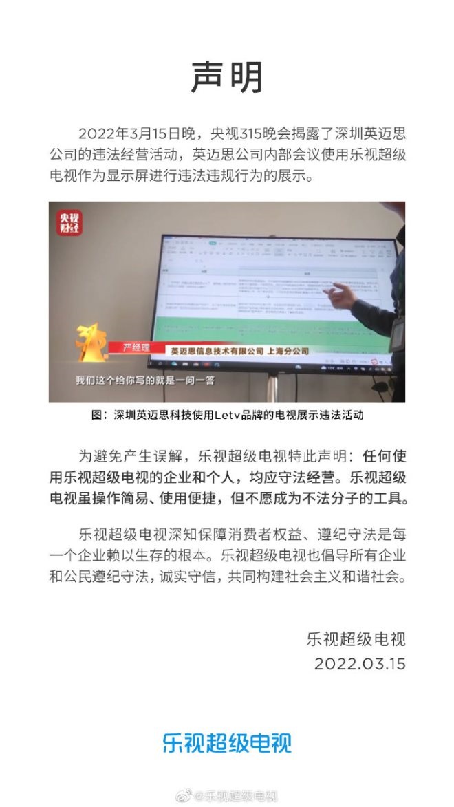 對此,@樂視超級電視官方在微博發(fā)文回應稱:2022年3月15日晚,央視315晚會揭露了深圳英邁思公司的違法經(jīng)營活動,英邁思公司內(nèi)部會議使用樂視超級電視作為顯示屏進行違法違規(guī)行為的展示。為避免產(chǎn)生誤解,樂視超級電視特此聲明:任何使用樂視超級電視的企業(yè)和個人,均應守法經(jīng)營,樂視超級電視雖操作簡易,使用便捷,但不愿成為不法分子的工具。