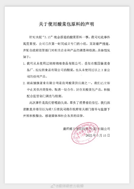 康師傅:插旗菜業(yè)是公司酸菜供應商之一,立即中止其供應商資格,取消一切合作,封存其酸菜包產(chǎn)品,配合監(jiān)管部門調(diào)查與檢測。