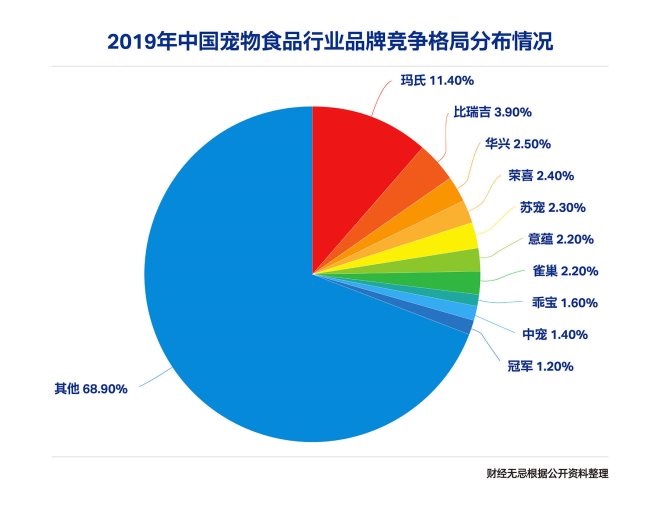 據(jù)《2020年中國(guó)寵物行業(yè)白皮書》顯示,目前國(guó)內(nèi)寵物食品市場(chǎng),瑪氏占據(jù)龍頭地位,市場(chǎng)份額占比為11.4%,其他品牌市場(chǎng)份額占比均在5%以下。