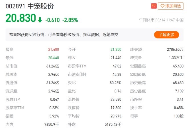 遺憾的是,高成長(zhǎng)性是屬于行業(yè)的,但卻并不屬于如今二級(jí)市場(chǎng)上的寵物食品概念股。中寵股份(002891.SZ)與佩蒂股份(300673.SZ)都在不同程度上經(jīng)歷著凈利下滑、增速放緩與自主品牌突圍難等問(wèn)題。以中寵股份為例,這一在寵物食品市場(chǎng)縱橫二十余年的老牌企業(yè)其股價(jià)距離高點(diǎn)近乎腰斬。