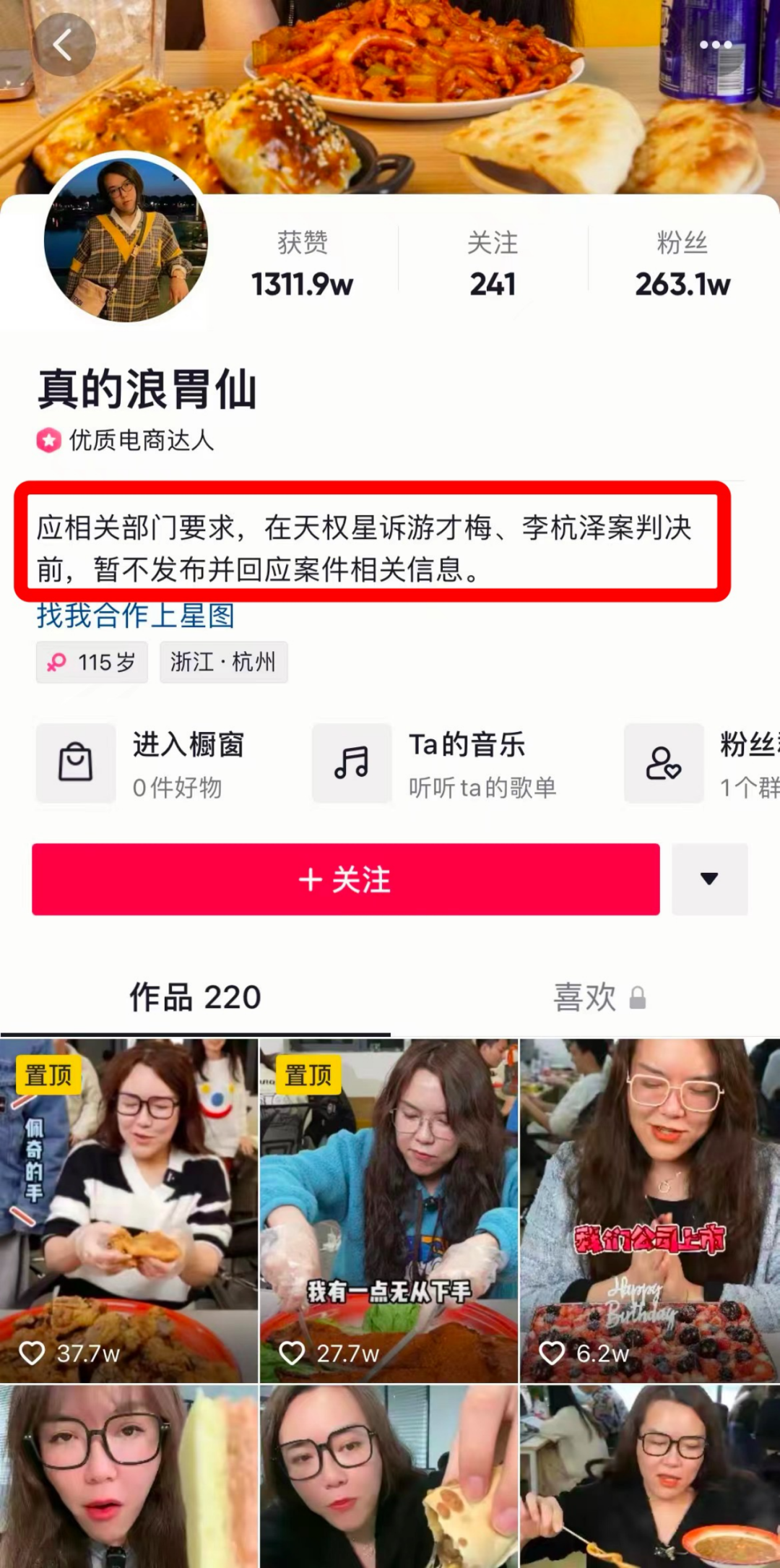 不過現(xiàn)在,游絮發(fā)布的三條視頻已然消失,浪胃仙的回應(yīng)視頻也不見了,浪胃仙在自己新賬號的簡介解釋“應(yīng)相關(guān)部門要求,在天權(quán)星訴游才梅(游絮)、李杭澤(浪胃仙)案判決前,暫不發(fā)布并回應(yīng)案件相關(guān)信息!