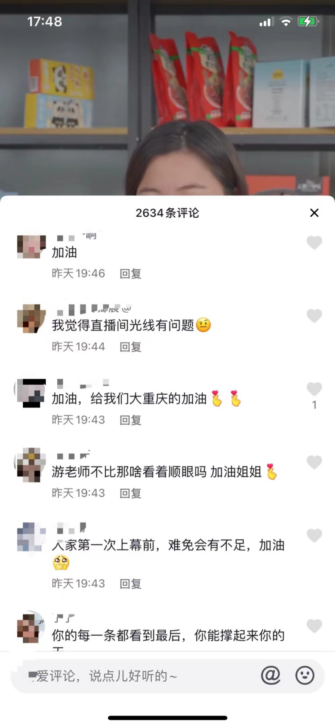 盡管在前期已經(jīng)做了充分準(zhǔn)備,但第一次直播的游絮還是難掩緊張,講話有些磕巴,甚至出現(xiàn)了多次口誤,粉絲們在彈幕里紛紛安慰“絮姐別緊張”“慢慢來,我們都支持你”,甚至有人說“絮姐,你別說了,快吃吧,我們自己會下單的。”