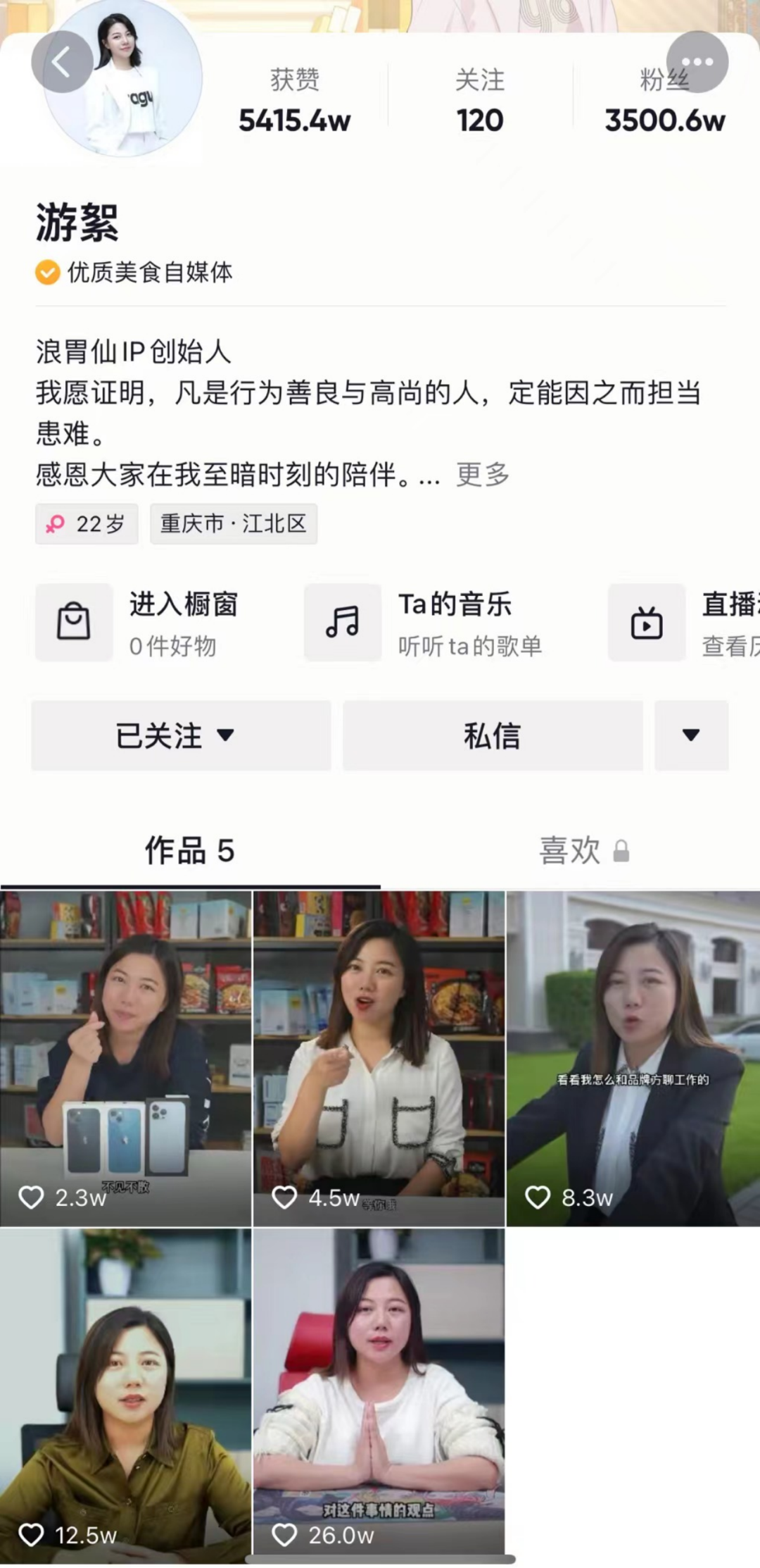 3月14日,浪胃仙前合伙人游絮在浪胃仙原有賬號上出鏡,開啟了直播帶貨首秀。只不過,賬號名稱已被改為“游絮”,此前關(guān)于浪胃仙的視頻也已經(jīng)全部刪除,但3500W粉絲依然存在。